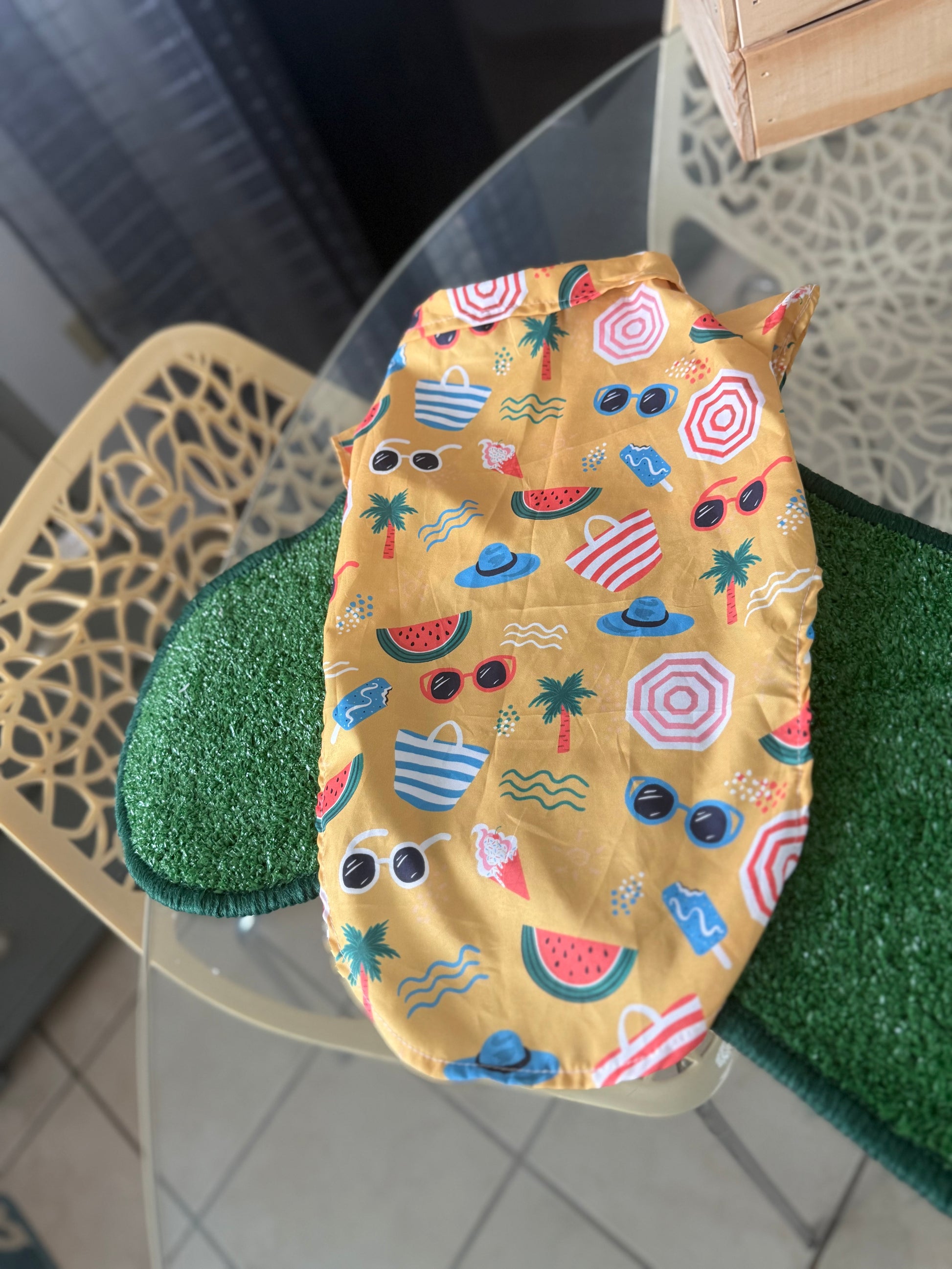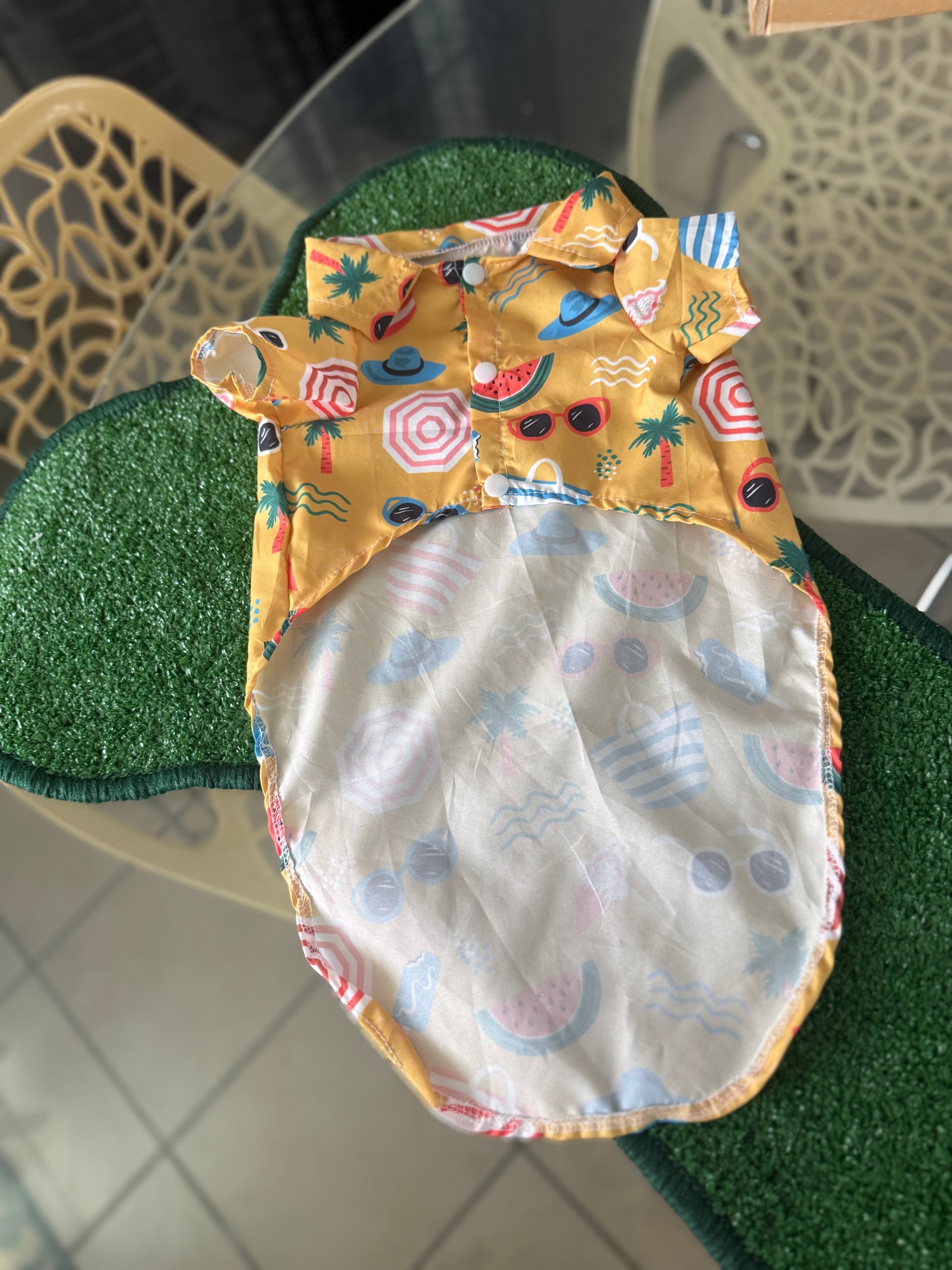 Camisa de botones. Con print amarillo tipo playa. El material es liviano para mantener a la mascota fresca.